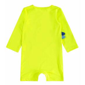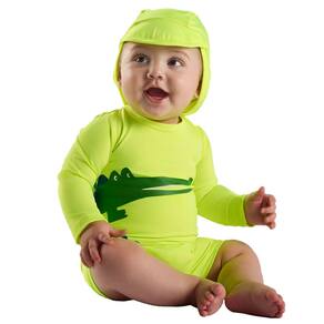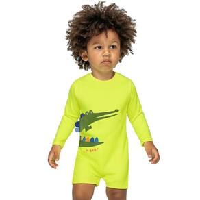 O Macaquinho de Praia Bebê e Infantil com estampa de Jacaré Amarelo Flúor Up Up Baby é confeccionado em Malha Poliéster com proteção solar UV FPS +50. Possui abertura entre as pernas para facilitar a troca e o vestir e o charme fica por conta do aplique de escamas na lateral.