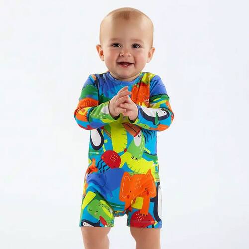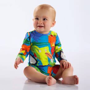 Conforto Total: Com mangas longas para proteção extra nos braços e ombros, o tecido é leve, tem toque geladinho, secagem rápida e alta elasticidade (stretch), permitindo que seu bebê engatinhe, corra e brinque livremente.