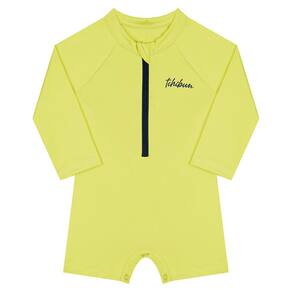 O modelo possui zíper frontal com protetor de tecido, evitando qualquer desconforto ou atrito no pescoço do bebê, além de abertura inferior com botões de pressão, facilitando as trocas de fraldas. A cor amarelo neon traz alegria e destaque para os dias de sol, combinando estilo e segurança em um só look.