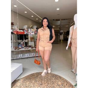O macaquinho na imagem é um macaquinho bege. Possui um estilo utilitário ou "cargo", com bolsos funcionais na parte superior e shorts, e apresenta gola esporte e fechamento frontal por botões. Em muitos modelos semelhantes, inclui um cinto para acinturar a peça, como o visto na foto. A modelagem é curta, com pernas terminando acima dos joelhos, e pode ter um caimento levemente solto ou mais ajustado, dependendo do modelo específico e do caimento do tecido. Marca: Não Informado