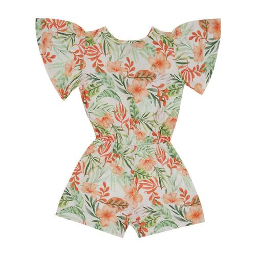Versátil e rápido, lookinhos com macacão são apostas certeiras para as fashionistas irem brincar com a amiguinha no parquinho. Confeccionado em malha leve, o macaquinho na cor laranja possuí estampa sublimada de flores e folhas tropicais. O conforto, liberdade e leveza em uma peça! \n