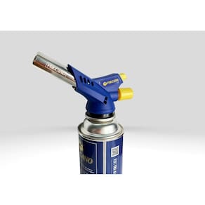 Coloque o maçarico na parte superior do refil Buddy O.K, segure a tampa redonda e rosqueie o maçarico no sentido horário. Para ativar o maçarico, destrave a trava de segurança na parte inferior do nosso maçarico, gire o registro de gás e acione o gatilho.