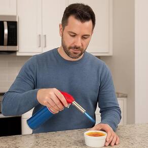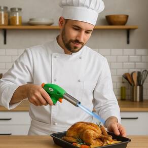 Ignição automática Super econômico Consumo de gás: 80g/h, 960kcal Utiliza Gás Butano (não incluso) Temperatura máxima: 1.300 C Encaixe para 2 tipos de refil Composição: ferro, plástico e aço