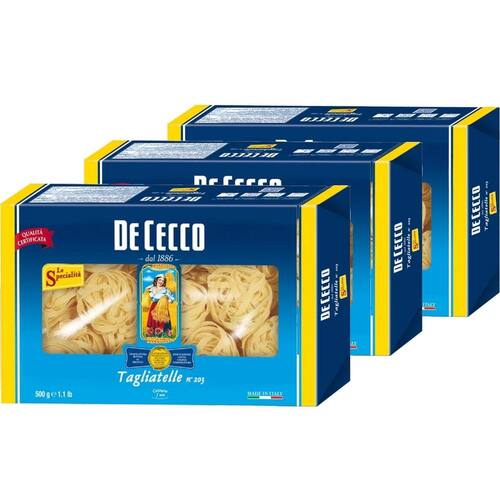 Macarrão DE CECCO Tagliatelle Nidi 500g 3 pacotes A história da De Cecco começou há mais de cem anos atrás em Abruzzo, uma história feita de paixão, exatamente como qualquer outra empresa. É a história do Moinho, e do pastifício dos irmãos De Cecco, que tem produzido massas há 130 anos e que se tornou sinônimo mundial de qualidade e do prazer italiano de comer bem. As raízes desta história se encontram na época anterior à unificação da Itália, quando em Fara San Martino, uma pequena vila situada aos pés da montanha Maiella, Don Nicola De Cecco produziu a melhor farinha das redondezas da cidade no seu moinho de pedra. com o passar do tempo muitas coisas mudaram: atualmente a marca De Cecco é sinônimo de alta qualidade no setor de massa de semolina e a De Cecco é o grupo que conta com um faturamento de mais de 200 milhões de euros, sendo que um terço provém de exportação.