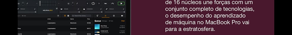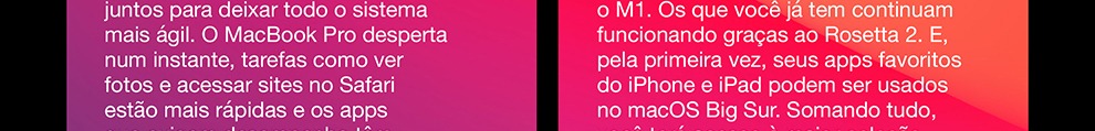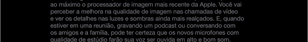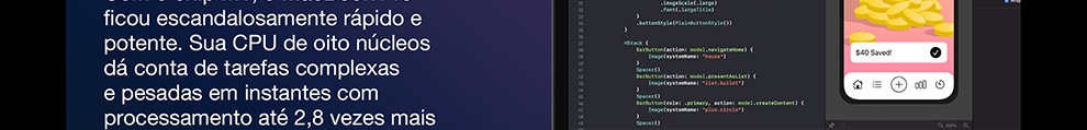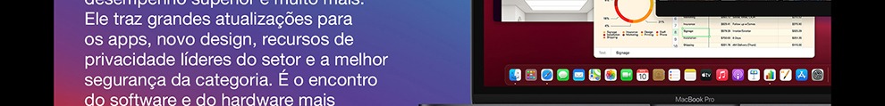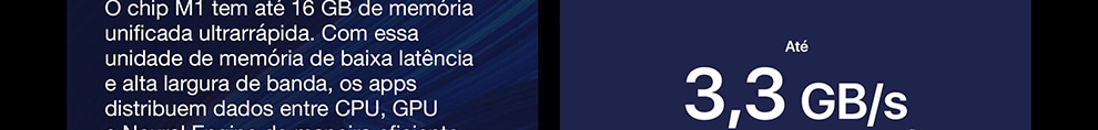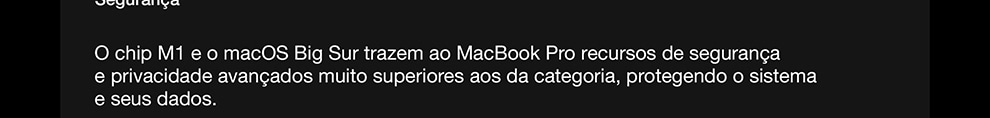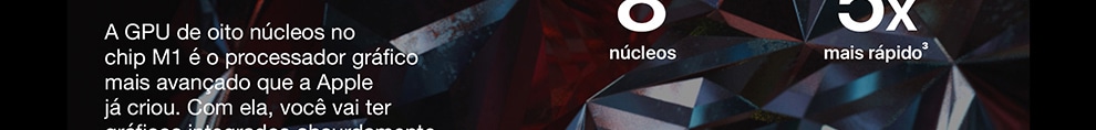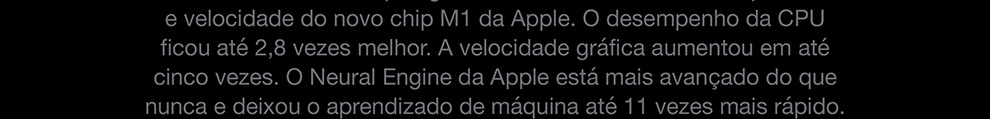 O MacBook Pro de 13 polegadas* está voando com o chip M1 da Apple. Sua CPU de oito núcleos encara com rapidez fluxos de trabalho complexos em fotografia, programação, edição de vídeo e muito mais. A GPU de oito núcleos dá conta de tarefas com gráficos pesados e roda muito melhor os jogos. O Neural Engine de 16 núcleos aumenta o poder do aprendizado de máquina dos seus apps favoritos. A memória unificada ultrarrápida traz consistência ao desempenho. E a bateria tem o maior tempo de duração em um Mac: até 20 horas**. Por fora, ele continua sendo o notebook profissional mais popular da Apple. Por dentro, mudou e vai mudar tudo.