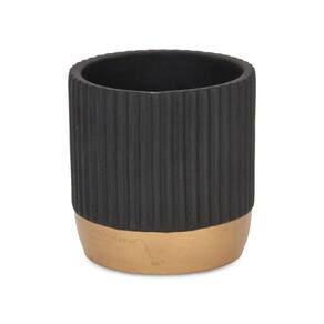 Maceta redonda estriada Aurone de Cheung con base terminada en dorado - Grande - Negro - Diseño totalmente hecho a mano y artesanal, pueden presentarse pequeñas variaciones - Lista para usar con tus plantas apenas la sacas de la caja - Esta pieza está hecha con materiales cerámicos terminados a mano - Diseñada con una textura ondulada repetida y una base curva - Acabado limpio en negro con una banda de acento dorado en la parte inferior