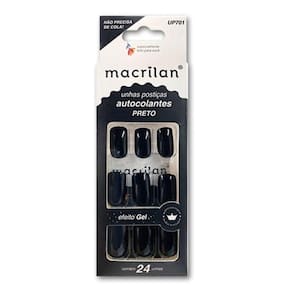 Macrilan Unhas Postiças Autocolantes Efeito Gel Preto Up701 (24 Unidades) Unhas Postiças Macrilan, especialmente desenvolvidas em uma versão colorida, tamanho médio e com adesivo autocolante para uma aplicação rápida e segura. Indicadas para uso pessoal e profissional. O Kit também tem lenços umedecidos, mini lixa e palito que ajudam a preparar a unha para a aplicação e remoção. Modo de usar: Preparação das unhas naturais Com as mãos limpas utilize os lenços umedecidos para remover a oleosidade das unhas.Lixe o corpo da unha para retirar possíveis ondulações que dificultem a aderência, se necessário. Preparação das unhas postiças Macrilan Selecione os tamanhos que mais se aproximam de suas unhas naturais.Lixe as laterais e a borda até que adquiram o tamanho desejado, se necessário. Aplicação das unhas postiças Macrilan Remova a película que protege o adesivo.Fixe a unha postiça em sua unha natural e pressione por alguns segundos.Repita o mesmo processo em todas as unhas.Evite contato com água por, no mínimo, uma hora após a aplicação. Remoção das unhas Retire as unhas delicadamente, iniciando pelas laterais, com auxílio do palito.Remova as unhas uma a uma, sem forçá-las. Dicas importantes: Não é indicado colocar as unhas postiças no dia que retirou suas cutículas ou quando a unha estiver doente. É aconselhável que haja um intervalo entre a remoção e uma nova aplicação. Esses procedimentos visam manter a saúde de suas unhas naturais. Conteúdo: 24 unhas postiças com adesivo autocolantes, 2 lenços umedecidos, 1 lixa e 1 palito. Tamanho: Unhas: tamanho médio para unhas adultas. Lenços: 60x30mm. Lixa: 35x15mm. Palito: 50mm. Composição: Unhas: Plástico ABS, polietileno, politereftalato de etileno, adesivo acrílico. Lenços: Álcool etílico e água. Lixa: Papel, polipropileno e EVA. Palito: madeira.