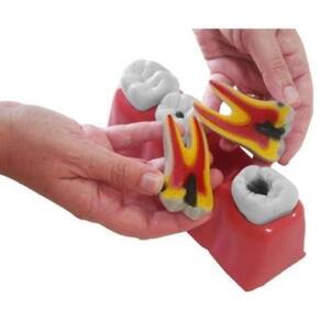 Base Plástica e Facilidade de Uso: O conjunto inclui uma base plástica rígida com dimensões de 25 cm x 8 cm x 8 cm, projetada para fornecer suporte estável e encaixe perfeito para os modelos dentários. Cada dente mede 9 cm x 5 cm x 4,5 cm e é encaixado individualmente na base, permitindo fácil remoção e recolocação para demonstração. Cada dente é dividido em duas partes, facilitando a visualização interna das lesões cariosas e a evolução da doença.