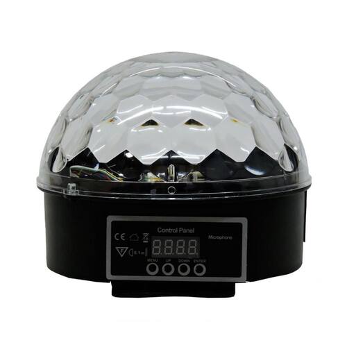 Composto por 6 LEDs de 3W cada, um motor para rotação dos feixes de luz e um acrílico com lentes óticas refratadas de alta qualidade, espalhando as cores à 180, proporcionando um longo alcance, feixes multiplicados e definidos (visto na fumaça).