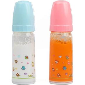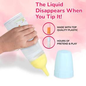 As garrafas de suco e leite desaparecem magicamente quando você as inclina e dá a impressão de que a boneca está realmente bebendo delas