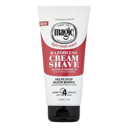 Dê a si mesmo um barbear limpo e confortável com este creme de barbear extra-forte SoftSheen-Carson Razor less Magic Shave Depilatório para barbas grossas.