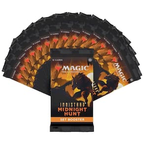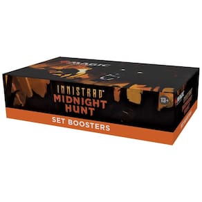 Cada Set Booster de Innistrad: Midnight Hunt inclui: 12 cartas de Magic. 1 carta de arte exclusiva. 1 ficha, carta de anúncio, carta de ajudante ou uma carta especial da história do Magic (conhecida como "A Lista").