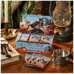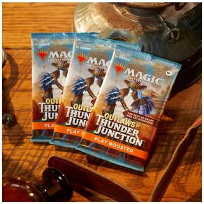 PODE CONTER CARTÕES DE ARTE, EXCLUSIVOS DO PLAY BOOSTER- Agora encontrados apenas nos Play Boosters, alguns pacotes também contêm um cartão de Arte que apresenta uma obra de arte do conjunto Outlaws of Thunder Junction, às vezes com uma assinatura do artista em folha.