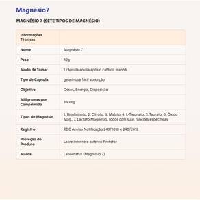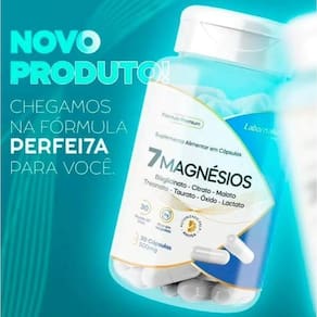 Nome do produto: magnésio 7 Suplemento: 7 tipos de magnésio Quantidade de cápsula: Tipo de cápsula: gelatinosa fácil absorção Miligramas por cápsula: 500mg Tipo de suplemento: alimentar Registro do produto: rdc notificação anvisa 243/2018 e 240/2018 Ingredientes: magnésio bisglicinato, citrato, malato, treonato, taurato, óxido e lactato Não contém: glúten, lactose, gordura trans, açúcares, sódio Modalidade da venda: unidade Rotulagem: todas as informações solicitadas pela anvisa Segurança: lacre interno e externo Embalagem: caixa protetora Origem do produto: nacional Marca: Não Informado