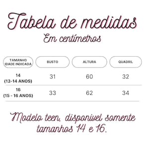 Tamanho 16 (Indicado para 15 à 16 anos) - Busto: 33 cm // Altura: 62 cm // Quadril: 34 cm