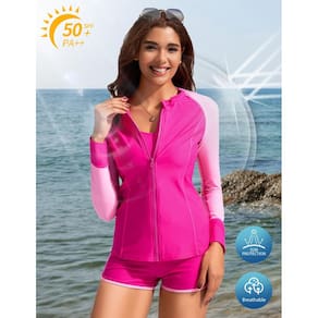 Não preciso sacrificar o estilo pela funcionalidade com este protetor de manga comprida. Os designs chiques de blocos de cores são modernos e atraentes. Sempre recebo elogios sempre que o uso, e isso me faz sentir confiante e elegante, esteja dentro ou fora da água.