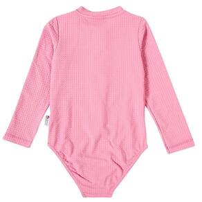 A modelagem do maiô manga longa body liso rosa em Lycra trabalhada Tip Top é normal. Verifique a tabela de tamanhos e em caso de dúvidas, sempre opte por um número maior do que a criança usa.