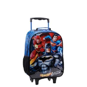 Em tamanho 14 , produzida em poliéster resistente e estampado. Painel frontal em PVC vincado - Compartimento principal amplo , 2 bolsos laterais mesh, zíper com puxadores personalizados, alça de mão em nylon com poliester e piping forrado. Carrinho em metal com travas.