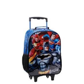 Em tamanho 14 , produzida em poliéster resistente e estampado. Painel frontal em PVC vincado - Compartimento principal amplo , 2 bolsos laterais mesh, zíper com puxadores personalizados, alça de mão em nylon com poliester e piping forrado. Carrinho em metal com travas.