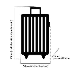 Produzidas em ABS, um material mais resistente, a mala de viagem de mão Dizy no tamanho PP tem medidas de 49 cm de altura, 30 cm de largura e 19 cm de profundidade, possui carrinho embutido regulável, alça superior e textura microdiamante.