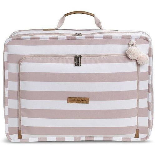 Mala de maternidade vintage masterbag brooklyn a mala vintage brooklyn é a companheira ideal para a ida à maternidade e futuras viagens com o seu filhote a combinação listrada do branco e rosa, combinado aos acabamentos em caramelo em aos pompons em lã, compõem uma peça atemporal e divertida. Com um amplo compartimento interno, essa mala oferece espaço para acomodar todos os itens essenciais do bebê, como roupas, fraldas e mantas. Os elásticos internos garantem a organização e segurança dos pertences durante viagens ou passeios. A mala acompanha três saquinhos organizadores estampados em poá que ajudam no planejamento da ida à maternidade. O bolso frontal conta com uma tela organizadora e é ideal para guardar os documentos do bebê. Com a mala vintage, mamães e papais terão a união perfeita entre estilo vintage e funcionalidade moderna para uma experiência de maternidade mais organizada e encantadora. Características principais: composição: parte externa: lona 100% poliéster com dublagem em algodão resistente / interno: pvc emborrachado. Dimensões: 50 x 37 x 18cm. Garantia contra defeitos de fabricação.