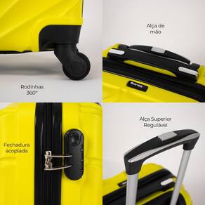 Fabricada em ABS, esta mala é resistente e durável, equipada com 4 rodas 360 que proporcionam fácil manobrabilidade. Possui cadeado fixo com senha para segurança, carrinho com ajuste de altura para maior conforto e alça de mão. No interior, conta com cinta elástica e divisória em zíper para manter tudo organizado. Além disso, a mala pequena é aprovada pela Agência Nacional de Aviação Civil (ANAC) para ir à bordo, tornando-a a escolha perfeita para suas viagens.