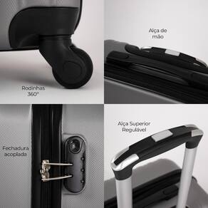 Fabricada em ABS, esta mala é resistente e durável, equipada com 4 rodas 360 que proporcionam fácil manobrabilidade. Possui cadeado fixo com senha para segurança, carrinho com ajuste de altura para maior conforto e alça de mão. No interior, conta com cinta elástica e divisória em zíper para manter tudo organizado. Além disso, a mala é aprovada pela Agência Nacional de Aviação Civil (ANAC) para embarque, tornando-a a escolha perfeita para suas viagens.