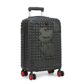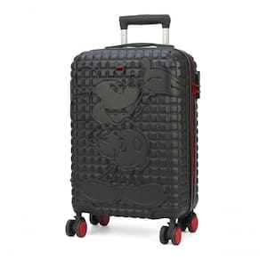Bolso interno com zíper Forro em poliéster personalizado Alça retrátil Rodas duplas com giro 360 Cadeado externo com segredo Abertura lateral com zíper personalizado Elástico interno Estampa premium Logo em metal Disney Mickey Mouse Divisória interna com fechamento em zíper personalizado Material: ABS