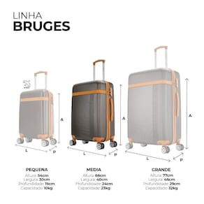 A mala média de viagem Bruges possui 66 cm de altura, 40 cm de largura e 24 cm de profundidade.