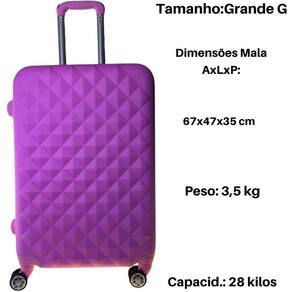 Viaje para qualquer destino com a segurança e o conforto da Mala de Viagem Grande tamanho G da Parana.Com design sofisticado e moderno, dessa mala de viagem, sendo a melhor opção para você levar seus pertences bem acomodados e seguros.Isso porque a mala é rígida, pois é confeccionada em ABS, o que garante uma estrutura forte e resistente. Além disso, possui 4 rodas giratórias em 360, carrinho embutido regulável, alça superior e fechadura segura.E tem mais: a Mala tem o interior totalmente forrado em poliéster, cinta elástica cruzada com trava e bolso interno, ideal para acomodar suas roupas de forma que evite bagunça.Para uma viagem tranquila e organizada, clique em comprar e ganhe 3 meses de garantia pelo fabricanteCaracterística da Mala de viagem Material: ABS4 rodasCarrinho embutido regulávelAlça superiorFechaduraTextura micro diamanteInterno: interior totalmente forrado em poliésterCinta elástica cruzada com travaBolso internoTamanho: Grande GDimensões Mala A x L x P: 67x47x35 cm Peso: 3,500 kgCapacidade: 28 kilos