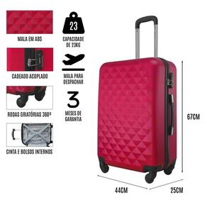 Características - Mala rígida em fibra ABS tamanho média (23kg); - Produto dentro das medidas para mala despachar; - Mala com cadeado de segredo (senha) acoplado; - Forração interna acolchoada;- Alça flexível superior para maior conforto e comodidade; - Bolso interno com zíper;- Rodas giratórias em 360º;- Carrinho retrátil com pintura eletrostática e botão liberador com dois níveis de ajustes.