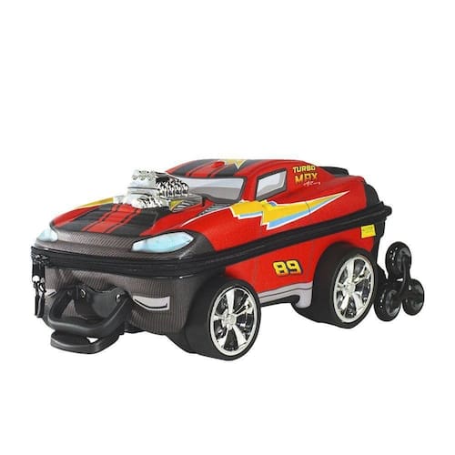 - Com um design inovador e super realista, essa mala se destaca pelo seu formato exclusivo de carro de corrida, com detalhes que encantam: rodas cromadas com visual brilhante, motor em alto relevo na parte frontal, pintura vibrante com efeito aerodinâmico, além das cores chamativas que remetem aos clássicos carros de competição.