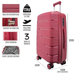 Mala média 23kg em polipropileno com rodas giratórias em 360º, zíper expansor e cadeado TSA Gladiador P2M.Características: - Mala rígida tamanho média em polipropileno - mais durabilidade e segurança para sua viagem; - Cadeado TSA com segredo embutido; - Zíper expansor; - Forração interna acolchoada; - Alças flexíveis superior e lateral para maior conforto e comodidade; - Bolso interno com zíper; - Rodas duplas giratórias em 360º; - Carrinho retrátil com pintura eletrostática e botão liberador.
