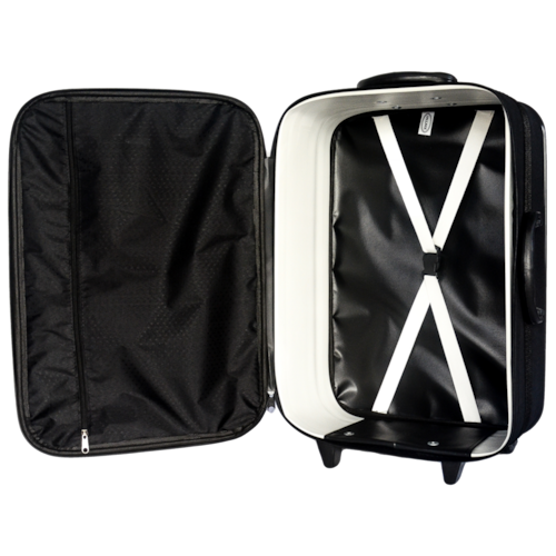 Especificações: Puxador: Plástico Rodinhas: Plástico Estrutura revestida com poliéster Alça de mão superior e lateral Fechamento com zíper em nylon Elástico para prender roupa Bolso interno na tampa Forro em nylon