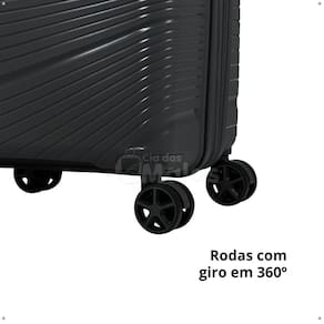 Rodinhas com giro 360º não removíveis proporcionam mobilidade suave em qualquer direção, facilitando o transporte em aeroportos e rodoviárias, trazendo ainda mais estabilidade e firmeza no deslocamento.