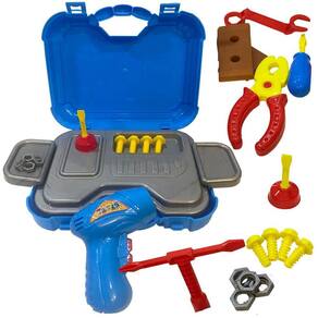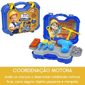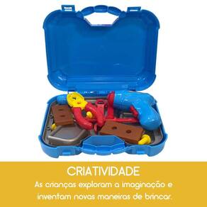 Maleta Bag Kit Ferramentas Brinquedo Infantil 11 acessorios Sua bancada portátil para consertos externos Essa linda maleta vem com suporte, furadeira, alicate, madeira, chave de fenda e parafusos. Perfeita para estimular as brincadeiras de faz de contas para as crianças.