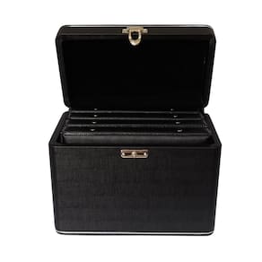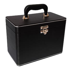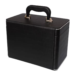 - Maleta em MDF revestida com material sintético e alça revestida e fechamento em metal.