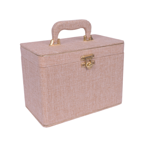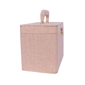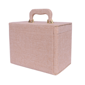 - Maleta em MDF revestida com juta e alça revestida e fechamento em metal.