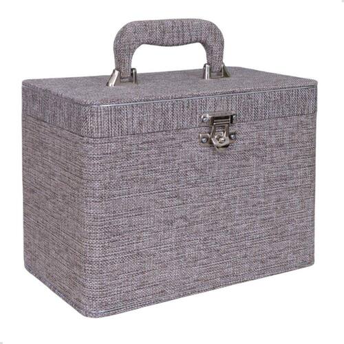 - Maleta em MDF revestida com juta e alça revestida e fechamento em metal.