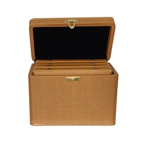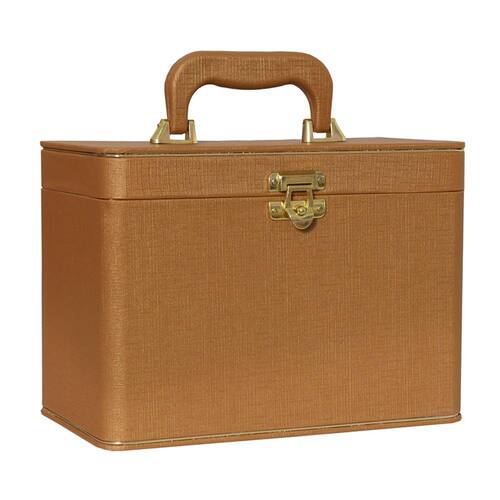 - Maleta em MDF revestida com material sintético e alça revestida e fechamento em metal.