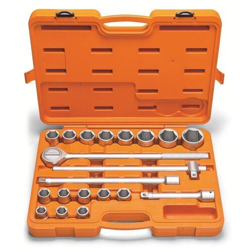Soquete forjado em aço cromo vanádio e temperado. Acabamento cromado. Perfil Hyper Drive (de cantos arredondados). DIN 3124. Suporte plástico. Um grande avanço na produção dos soquetes é a introdução do conceito Hyper Drive. Este novo perfil melhora o acoplamento do soquete na porca ou parafuso, reduzindo as tensões geradas no aperto, prolongando a vida do soquete e do elemento de fixação. Os soquetes são submetidos a testes rigorosos de torque e de dureza para atender a norma DIN 1711-1. Afrouxar e apertar parafusos e porcas sextavados. As ferramentas são produzidas e testadas conforme normas específicas. Conteúdo: 16 soquetes sextavados: 19, 21, 22, 23, 24, 26, 27, 29, 30, 32, 34, 36, 38, 41, 46, 50 mm, 4 acessórios: cabo T 20 polegada, 2 extensões 8 polegada, 15 polegada, catraca 20 polegada, caixa plástica.