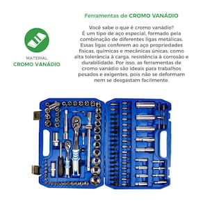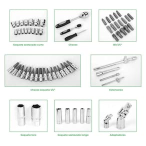 Esse conjunto inclui uma variedade de ferramentas manuais, como chaves, soquetes, alicates e muito mais, projetadas para uma ampla variedade de aplicações, como reparos automotivos, manutenção de veículos e trabalhos de casa. Esses conjuntos de ferramentas são utilizados por mecânicos profissionais, engenheiros e técnicos de manutenção. Acompanha um estojo para armazenamento organizado. Ter um conjunto de ferramentas versátil pode economizar tempo e esforço em várias tarefas de manutenção e reparo. Kokay, um mundo de facilidades para você Especificações Técnicas: - Quantidade de peças: 108 - Tipos de peças: soquetes sextavados e bi-hexagonais, chaves catraca, extensões, adaptadores, juntas universais, bits, chave allen e acessórios diversos - Material: aço cromo vanádio Cr-V - Acabamento: cromado, resistente à corrosão - Faixa de bitolas: 4mm a 32mm soquetes - Utilização: automotivo, industrial, oficina, manutenção e reparos em geral - Maleta: plástica reforçada com encaixe para todas as peças - : 1 ano contra defeitos de fabricação