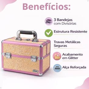 Maleta de Maquiagem Cisne Linha Shine Salmão Glitter e Rosa com 3 Bandejas – CSN-5171B A Maleta de Maquiagem Cisne Linha Shine é perfeita para quem busca organização, praticidade e muito estilo. Com acabamento Salmão Glitter e detalhes em rosa, ela traz um visual premium e estrutura resistente para guardar maquiagens, pincéis e acessórios com segurança. Possui 3 bandejas articuladas, que facilitam a visualização e deixam tudo sempre à mão — ideal para uso pessoal ou profissional.