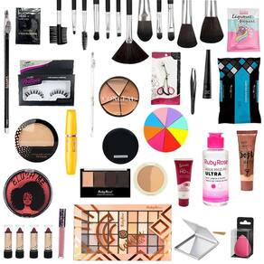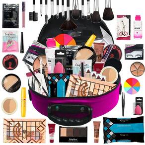 1- Primer; 4 - Tonalidades deCorretivos Paleta; 1- Mascara de Cravos Black Head Pilatens (Cortesia da Loja); 1- DuoIluminadorPaleta; 1- Blush; 1- Lápis de olho Preto; 1- Lápis de olho Branco; 1- Delineador liquido; 1- Esponja gota; 1- Esponja tipo pizza (Conforme modelo disponível em estoque); 1- Par de cílios postiços; 1- Curvador de cílios; 1- Espelho para auto maquiagem; 25 -Lenços demaquilantes; 1- Pinça para aplicação de cílios; 4 - Batons Bastão Matte luxo; 1- Batom Matte Liquido; 1- Lágrimas de Unicórnio 8ml ou Máscara Ouro( Cortesia da Loja); 1- Água miscelar; 1- Paletade Sombras para Sobrancelha; 1 - Maleta Frasqueira para Maquiagem; 1- Pincel aplicador de pó facial; 1- Pincel aplicador de blush; 1- Pincel delineador sombra topo reto; 1- Pincel chanfrado; 1- Pincel leque ou vassourinha; 1- Pincel para lábios; 1- Pincel aplicador de rímel; 1- Pincel duo para cílios e sobrancelha; 1- Pincel esponja; 2 - Pincéis para aplicação de Sombra; 1- Pincel para aplicar delineador;
