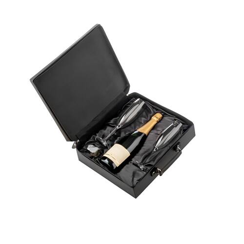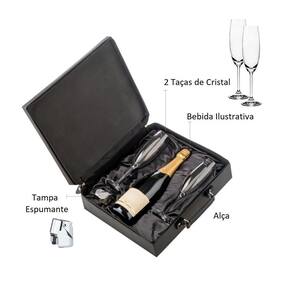 Maleta em courino para 1 garrafa de espumante 750ml: Acompanha no Conjunto: - Maleta em Courino Preto com Alça - 2 taças de cristal ecológico para espumante 220ml - 1 tampa para espumante (não acompanha bebida)