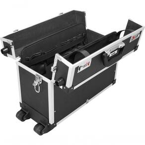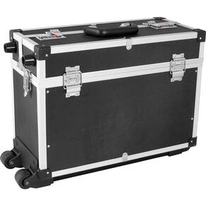 Possui estrutura rígida revestida externamente em alumínio na cor preta, além de cantos plásticos e laterais reforçadas com cantoneira de alumínio, conferindo maior durabilidade. Revestida internamente com material sintético macio (EVA). Acompanha 2 porta-ferramentas removíveis, dispositivo para transporte com alça telescópica e rodas que facilitam o transporte. Conta ainda com travas e dobradiças em aço e fechadura com segredo personalizável.