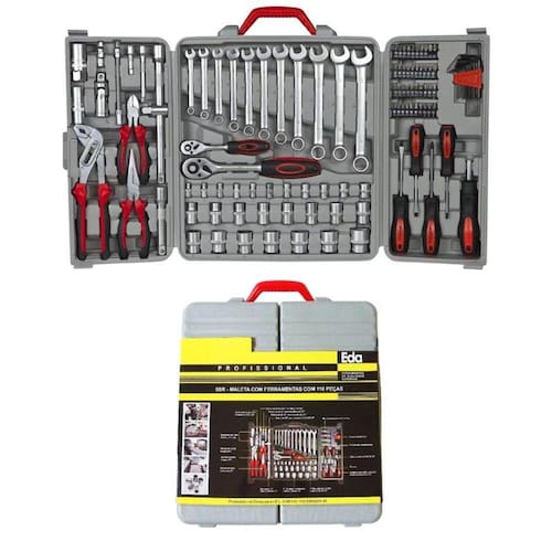 Maleta ferramentas jogo kit com 110 peças completa. marca edacódigo eda9srconteúdo da embalagem 1 jogo de ferramentas com 110 peças maleta dobrável1 alicate de corte diagonal 61 alicate de meia cana 81 alicate bomba dágua 101 adaptador para bits com cabo e catraca encaixe de 1/4bits com encaixe de 1/4 sendo:7 bits fenda 3,5 2 peças, 4 2 peças, 5,5, 6,5 e 8 mm3 bits quadradas: s1, s2 e s3.8 bits phillips ph0 2 peças, ph1 2 peças, ph2 2 peças e ph3 2 peças2 adaptadores7 bits torx t10, t15, t20, t25, t27, t30 e t404 bits triwing 1, 2, 3 e 46 bits allen 2, 3, 4, 5, 6 e 7 mm1 cabo t de 10 com extensão encaixe de 1/21 catraca reversível de 10 com encaixe de 1/21 catraca reversível de 6 com encaixe de 1/42 chaves de fenda 5,0 x 75 mm, 6,0 x 100 mm2 chaves phillips 1 x 75 mm, 2 x 100 mm11 chaves combinadas 8, 9, 10, 11, 12, 13, 14, 15, 17, 18 e 19 mm8 chaves hexagonais 1.5, 2, 2.5, 3, 4, 5, 5.5 e 6 mm1 extensão de 5 com encaixe de 1/21 extensão de 2 com encaixe de 1/41 extensão de 4 com encaixe de 1/41 extensão flexível 6 1/4 m x 1/4 f1 junta universal com encaixe de 1/21 junta universal com encaixe de 1/42 soquetes de vela 16 mm e 21 mm15 soquetes sextavados com encaixe de 1/2 10, 11,12, 13, 14, 15, 17, 18, 19, 21, 22, 23, 24 e 27 mm11 soquetes sextavados com encaixe de 1/4 4, 5, 6, 7, 8, 9, 10, 11, 12, 13 e 14 mm1 suporte para chaves hexagonais4 suportes para os bits1 maleta com berços e identificação de medidasdimensões da caixa 40 cm x 36 cm x 9 cmgarantia 90 dias contra defeito de fabricação 1 imagens e fotos meramente ilustrativas.