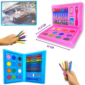 O que você vai receber em sua casa conteúdo da embalagem : - 1 maleta de pintura infantil que contém: 6 giz de cera, 12 cores de aquarela, 4 ligue os pontos, apontador, borracha, pincel e lápis.