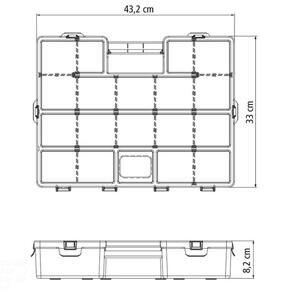 A Maleta Organizadora Plástica 17" Tramontina com Módulos Organizadores e Divisórias Móveis vai deixar suas ferramentas mais organizadas e fáceis de transportar! Produzida em plástico, possui divisórias e organizadores que facilitam o transporte e armazenamento. Além de ferramentas, ela é ótima para guardar artigos de pesca, entre outros acessórios. Um produto funcional que serve para deixar seus objetos em ordem. Orientações Corpo e divisórias móveis injetadas em polímero de alta resistência; 8 divisórias móveis que possibilitam a personalização do espaço interno da maleta; 5 módulos organizadores simples; 6 módulos organizadores duplos; Tampa transparente com reforços que aumentam sua resistência; 4 Travas para fechamento seguro (2 frontais e 2 laterais); Projetada para fácil personalização e portabilidade; Possibilita encaixar martelo de tamanho pequeno e médio; Características Gerais EAN13 7891114164947 DUN14 17891114164944 NCM 3923.10.90 Peso Líquido 1,7700 kg. Peso Bruto 2,0400 kg. Metragem 0,014537 m³. Dimensões Embalagem (Compr. X Larg. X Alt.) 455x 355x 90 mm. Dimensões Produto (Compr. X Larg. X Alt.) 455x 355x 9 mm. Observações Sempre utilizar óculos de segurança para proteger os olhos. Utilizar luvas para proteger as mãos. Não sobrecarregar as caixas de ferramentas com peso excessivo. Sempre manter as caixas trancadas durante sua movimentação ou transporte. Não apoiar peças sobre as caixas para realizar qualquer trabalho. As caixas são submetidas a testes de aplicação prática para garantir sua resistência durante o uso.