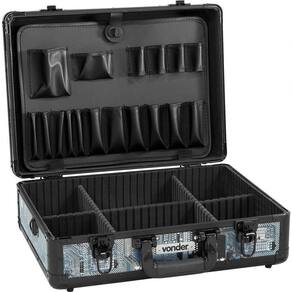 Destaques e diferenciaisPossui estrutura rígida revestida externamente em alumínio, com estampa imitando placa eletrônica, além de cantos em aço e laterais reforçadas com cantoneira de alumínio, ambos na cor preta, conferindo maior durabilidade. Revestida internamente com material sintético macio (EVA), com 5 divisões internas removíveis e ajustáveis que adequam-se a diferentes tamanhos e formatos de ferramentas. Acompanha porta-ferramentas removível e alça auxiliar em nylon. Conta ainda com 2 fechos metálicos com chave e fivelas e dobradiças em aço.